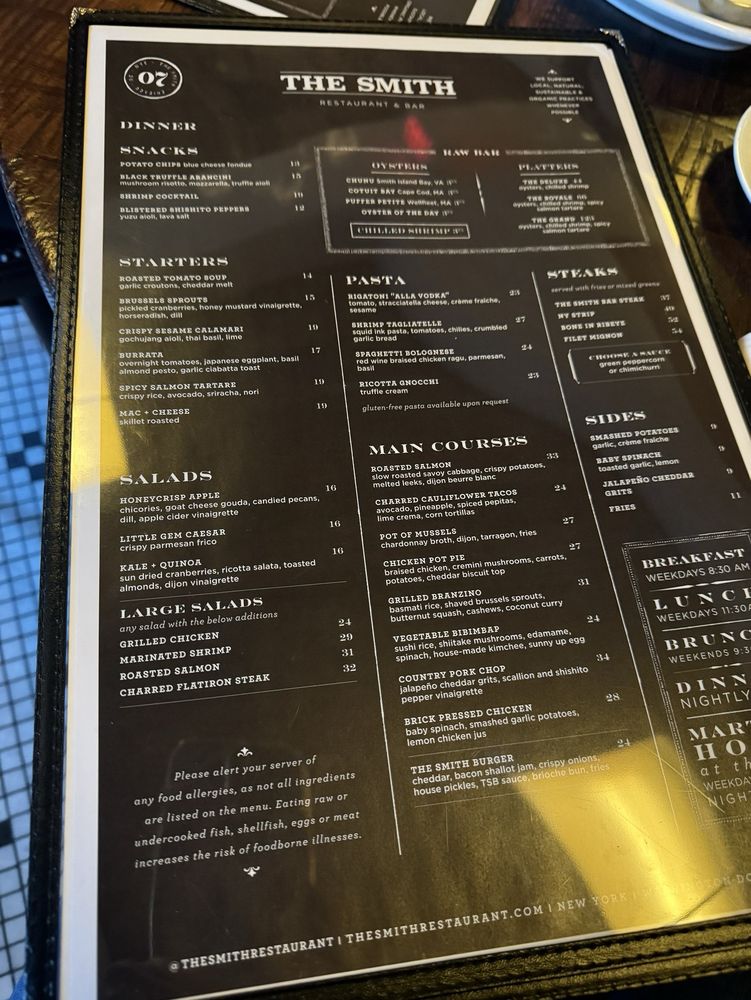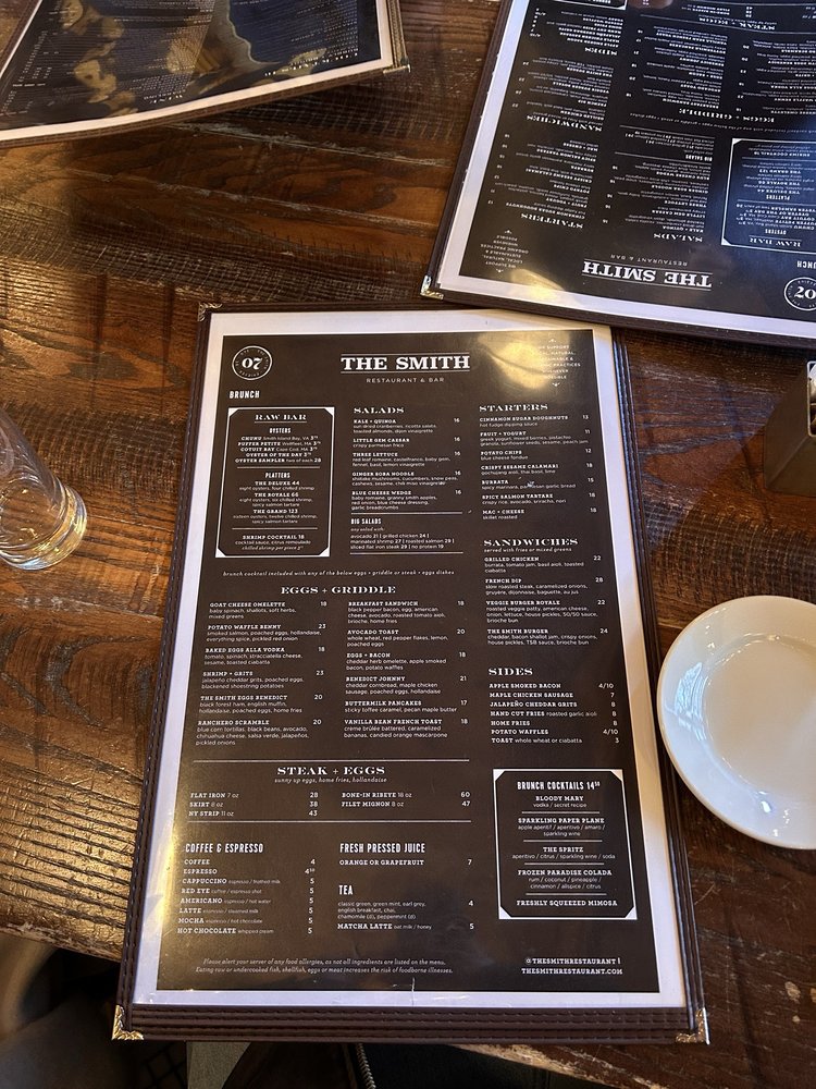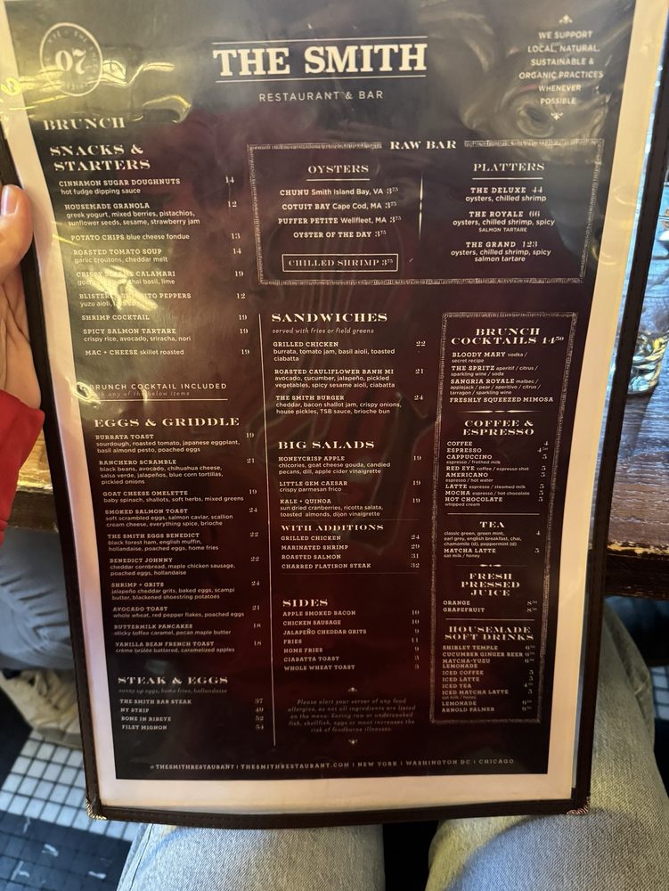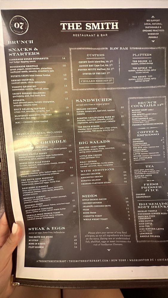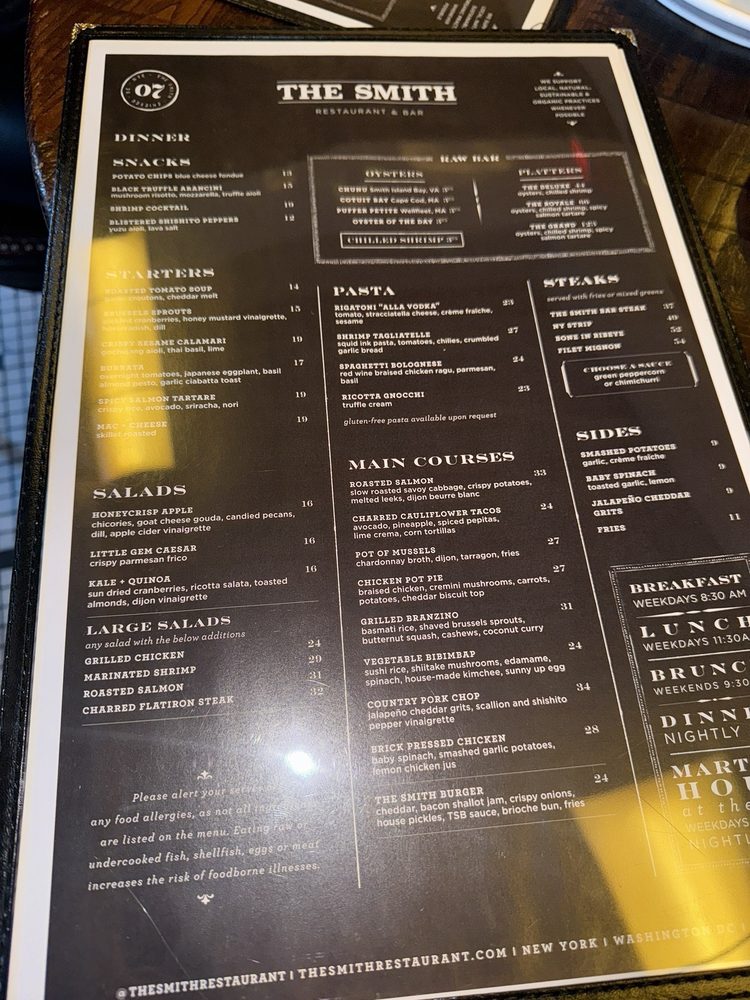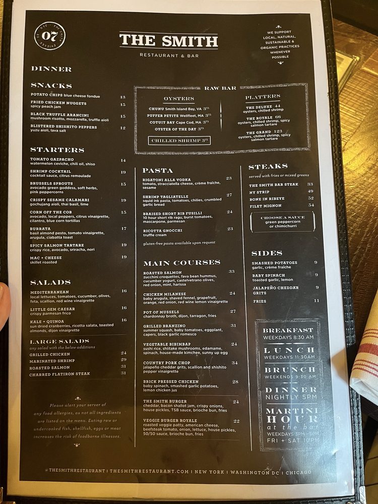 Introducing the menu at The Smith, located in Washington, DC, offers a variety of New American cuisine with a focus on breakfast and brunch. The restaurant boasts vegan options, delivery, takeout, and wheelchair accessibility. Highlights from the breakfast menu include dishes like the Goat Cheese Omelette, Chicken Sausage and Eggs, and the Potato Waffle Benny. Customers praise the fresh and flavorful Mussels and the delectable Potato Chips with blue cheese fondue. The atmosphere is described as casual, trendy, and classy, making it perfect for a casual dining experience or happy hour. With attentive staff, delicious food, and a cool historic setting, The Smith is a top choice for those looking for a memorable dining experience in DC.